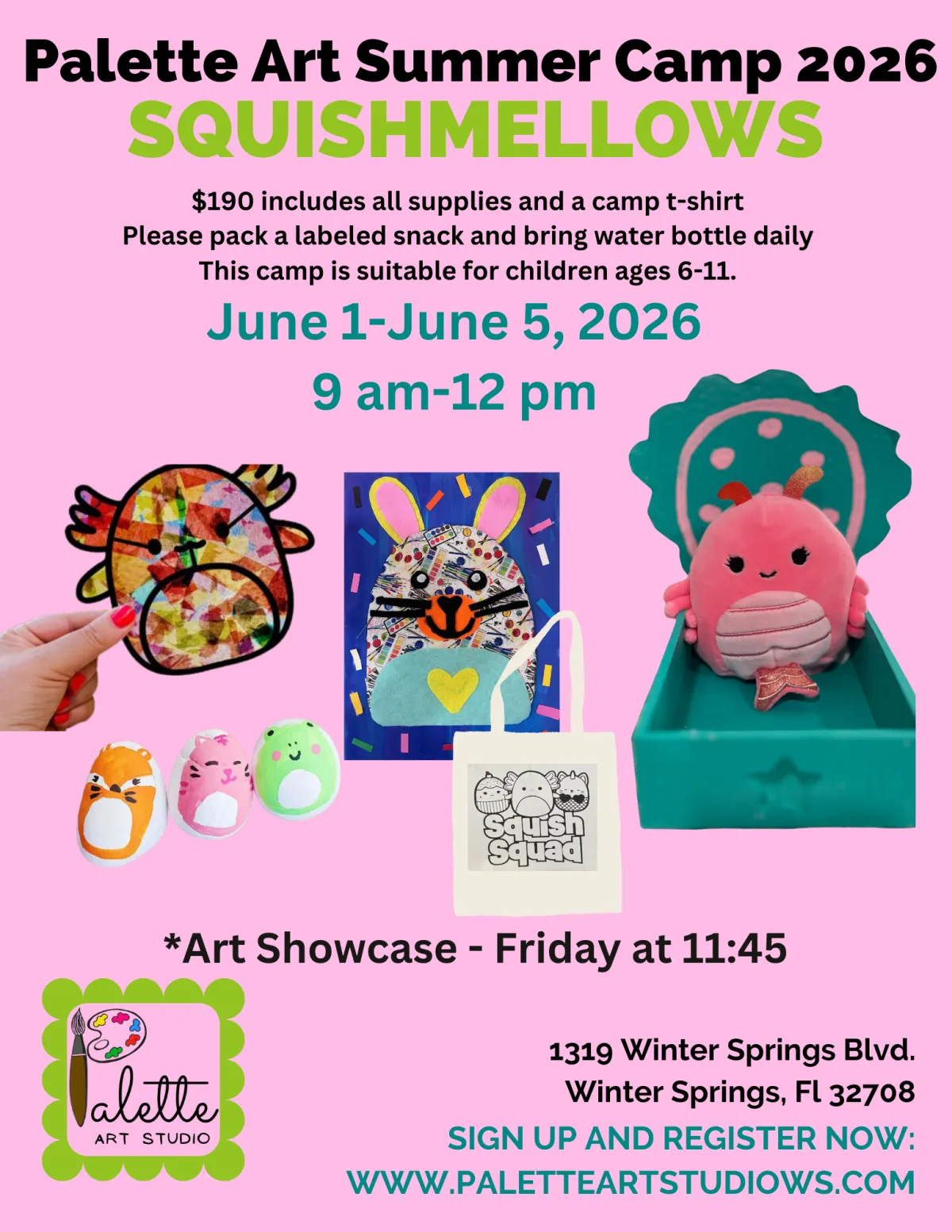 Come spend 5 days with us crafting themed art projects. All supplies are included, and you will receive a camp T-shirt. Please pack a labeled snack and water bottle for each day. We will have an Art Show on Friday at 11:45