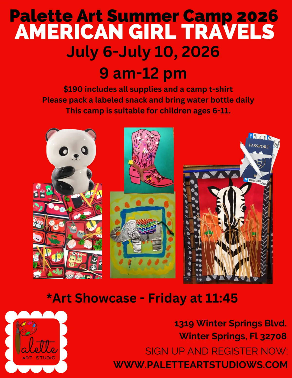 Come spend 5 days with us crafting themed art projects. All supplies are included, and you will receive a camp T-shirt. Please pack a labeled snack and water bottle for each day. We will have an Art Show on Friday at 11:45