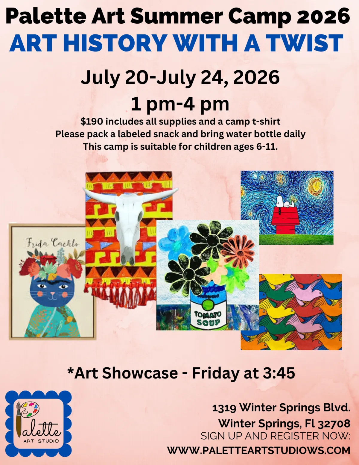 Come spend 5 days with us crafting themed art projects. All supplies are included, and you will receive a camp T-shirt. Please pack a labeled snack and water bottle for each day. We will have an Art Show on Friday at 3:45