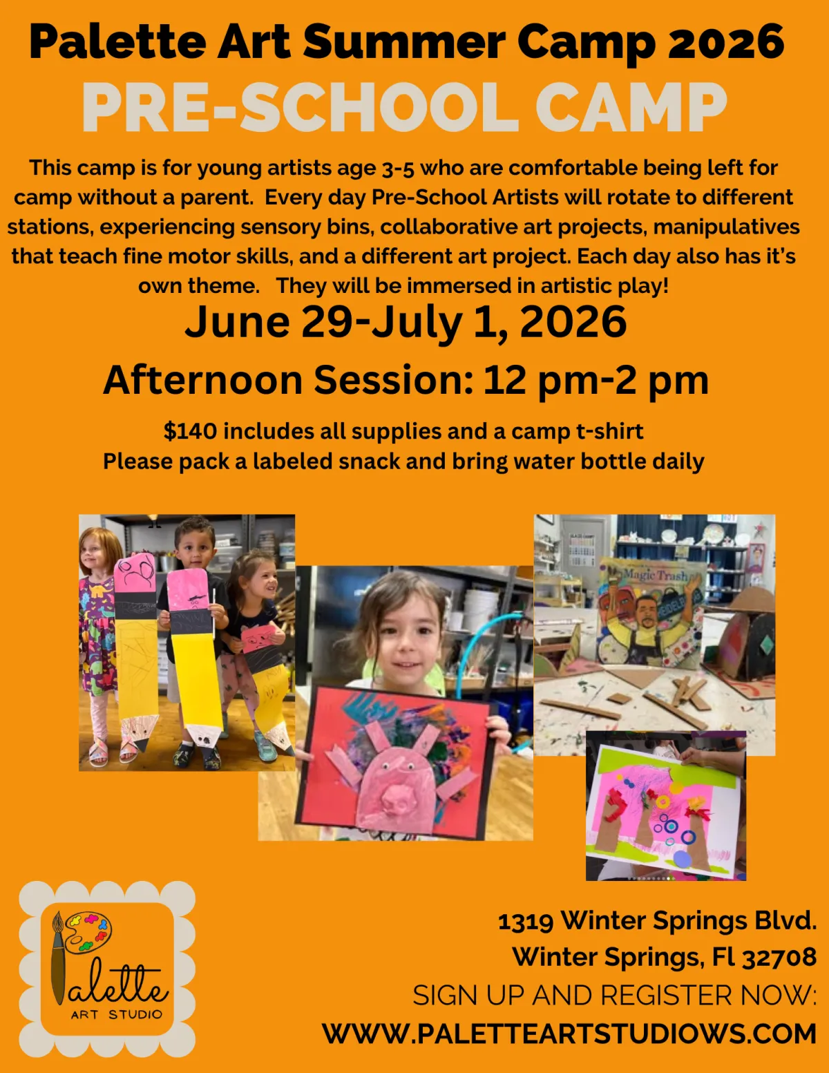 Come spend 3 days with us crafting themed art projects. All supplies are included, and you will receive a camp T-shirt. Please pack a labeled snack and water bottle for each day. We will have an Art Show on Friday at 1:15