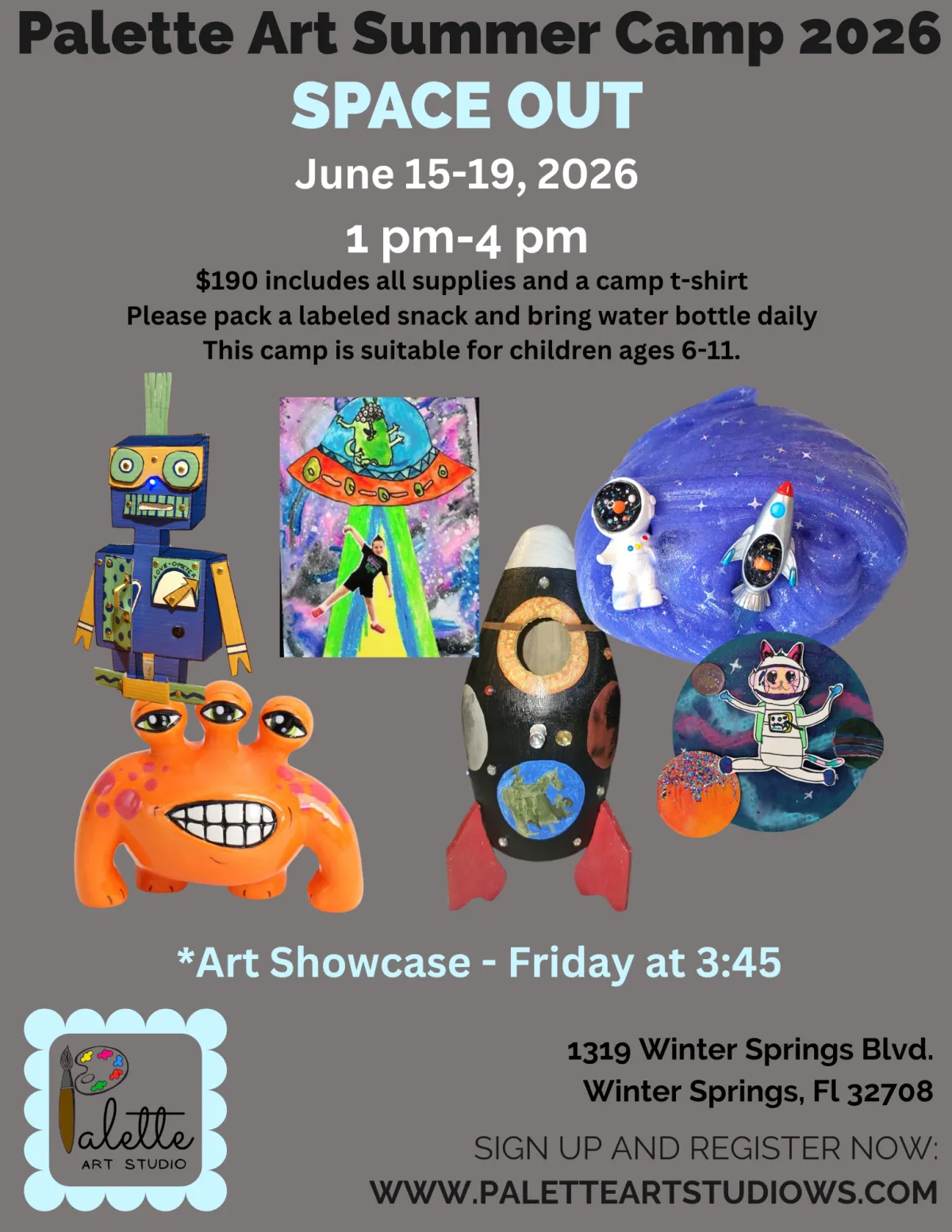Come spend 5 days with us crafting themed art projects. All supplies are included, and you will receive a camp T-shirt. Please pack a labeled snack and water bottle for each day. We will have an Art Show on Friday at 3:45